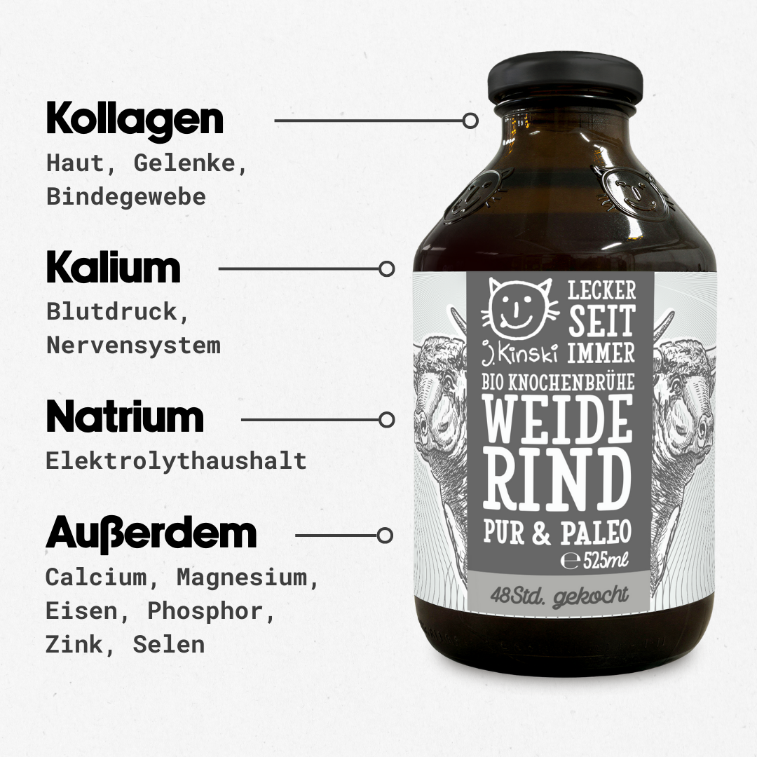 Knochenbrühe gilt als eines der ältesten Hausmittel bei Erkältung oder allgemeinem Unwohlsein, da sie Energie liefert, ohne das Verdauungssystem zu belasten. Unsere J.Kinski Knochenbrühe ist in Sachen Nährstoffkonzentration – vor allem Kollagengehalt – vergleichbaren Produkten weit voraus.