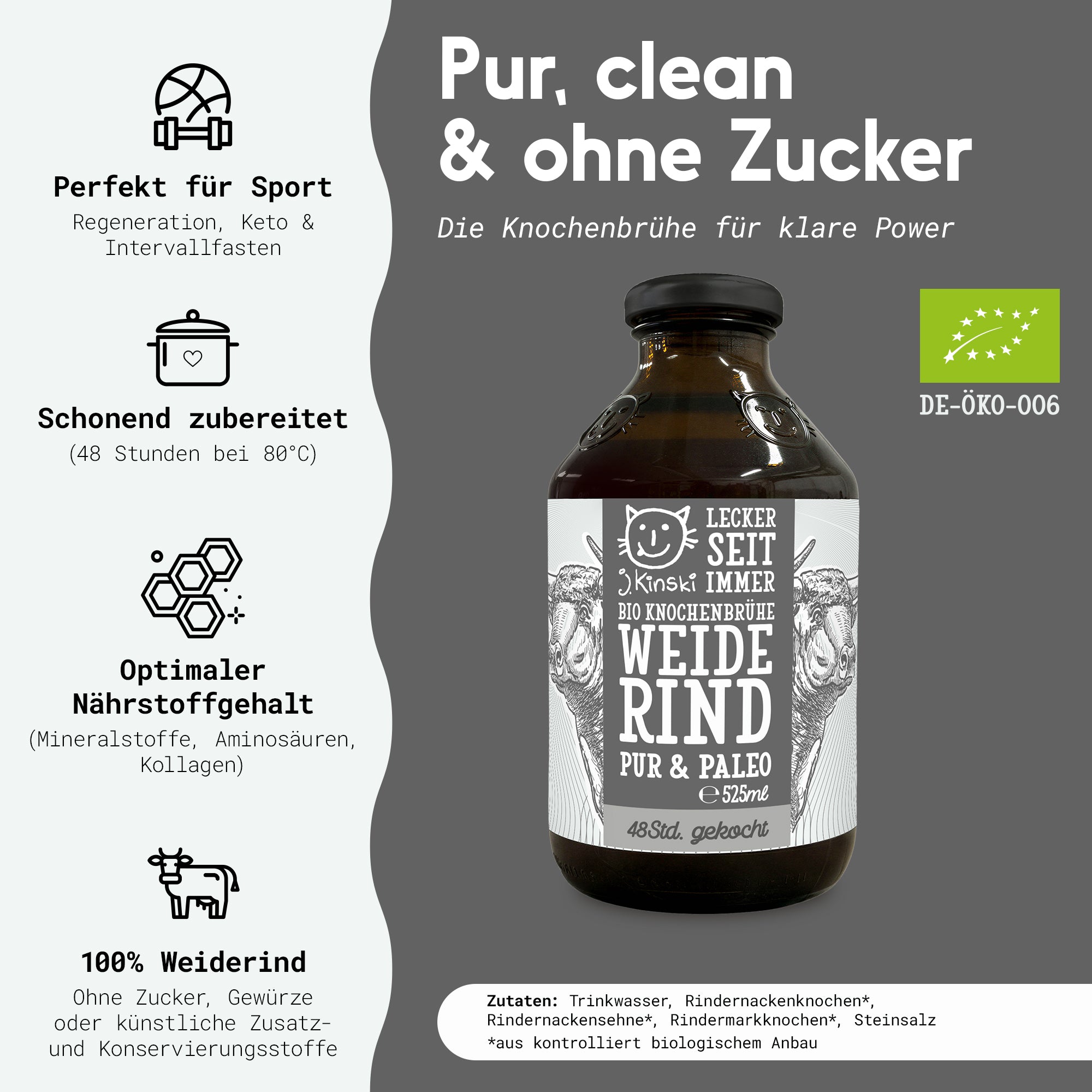 100% Bio-Weiderind aus Deutschland, schonend über 48h gekocht - ohne Zucker oder sonstigem Kram.