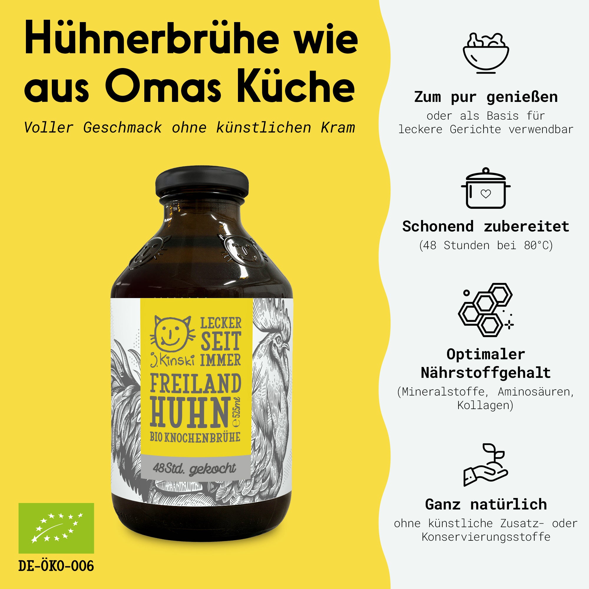 Knochenbrühe aus Rind enthält die ultimative Nährstoffkombi aus Kollagen, Gelatine, Aminosäuren und Mineralstoffen, welche Gelenke, die Haut, das Verdauungssystem und das Immunsystem unterstützen kann. Bei Hühnerknochenbrühe ist es der hohe Anteil an Zink und Eisen, den unser Körper gerade bei Krankheit oder zur Verbeugung gut gebrauchen kann.